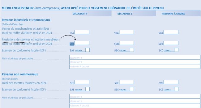 Pour les micro-entrepreneurs, les recettes doivent être portées sur la (ligne 5TB – revenus industriels et commerciaux – prestations de services et locations meublées) :