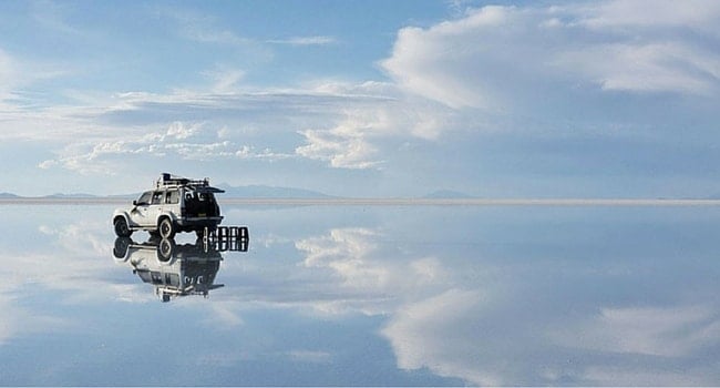 Une voiture qui flotte en plein désert. Attention à la flaque !